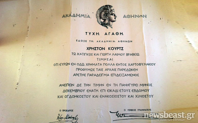 Λίγες ημέρες αργότερα, ο 14χρονος βραβεύτηκε από τον τότε υπουργό Παιδείας, Αντώνη Τρίτση για την τιμιότητά του. Εκτός από τον πάπυρο της Ακαδημίας Αθηνών, του δόθηκε και το ποσό των 200.000 δραχμών ως αμοιβή για την καλή του πράξη. «Με τα χρήματα αυτά βοήθησα τη μητέρα μου. Πήγαμε σε ένα καλύτερο σπίτι να ζήσουμε», συνεχίζει σήμερα, 25 χρόνια μετά το περιστατικό.